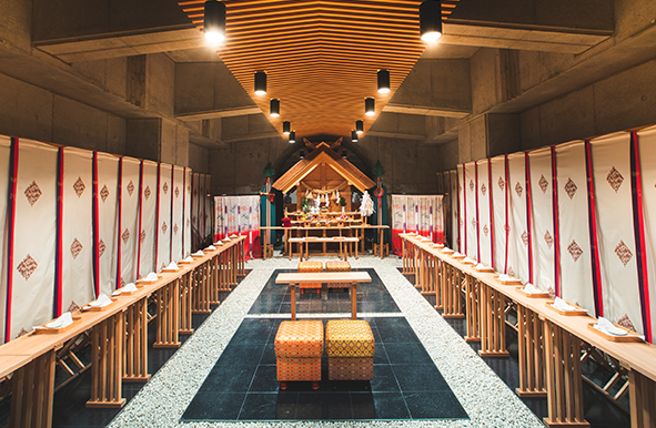 谷崎さん:1つ目は「クリスタルチャペル」。深海のチャペルをイメージしていて華やかな雰囲気とロングバージンロードが特徴です。2つ目は「出雲大社神楽殿」。無垢材とコンクリートを調和させたスタイリッシュモダンな神前式場で、厳かで重厚感があります。全国的にはチャペル式でのセレモニーが9割を占めていると言われていますが、当ホテルでは洋・和が半々くらいなんですよ。