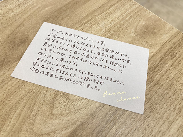 八戸さん:オープンして間もない頃に新規のお客様からお手紙をいただいたこと。その方はInstagramを見てご来店してくださったんですけど、お手紙には「家の近くに託児付きの美容室ができて嬉しいです」と書かれていて…。“子連れでも気軽に通えるサロン”というコンセプトでお店を作って良かったなと強く実感しました。