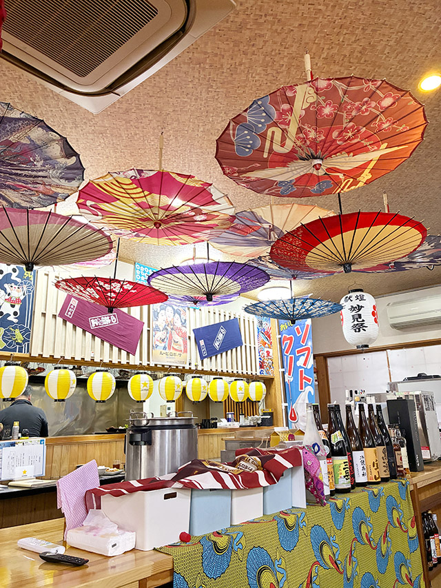 八代市横手新町の大通り沿い、ライトブルーの店頭幕が印象的な「お食事処莞爾(かんじ)」。玄関の扉を開けると、天井からは色とりどりの和傘が吊るされ、壁には和柄の帯や手ぬぐいが粋にレイアウトされています。