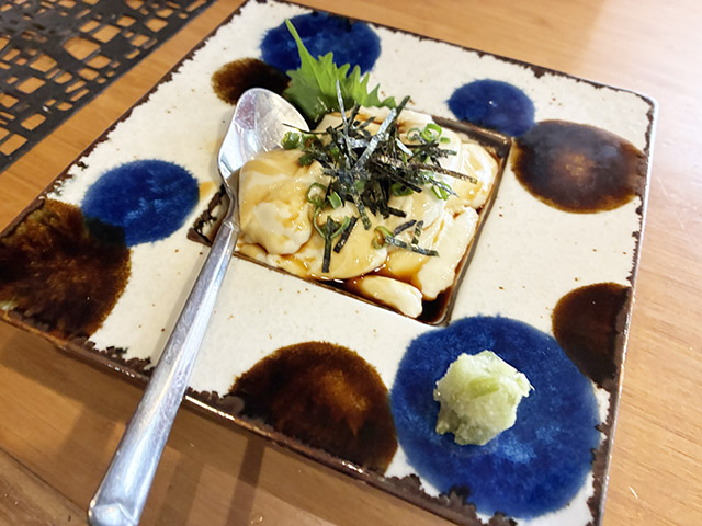 野中さん:おっ、目の付け所がいいですね!これはにがりを使わずに、葛粉と生クリームを入れて手作りしているんです。驚くほどもっちり・しっとりした新感覚の食感。基本は甘醤油と刻みわさびでお出ししていますが、黒蜜をかけてデザート感覚で楽しむのも好評なんです。特に女性のお客様からは「一度食べたら忘れられない」とリピートしていただくことが多い一皿ですね。