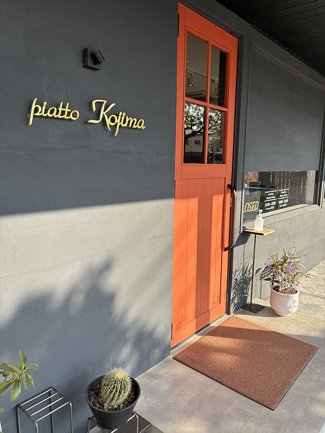 八代市の市街地南西部に位置し、商業施設や生活施設が点在している八代市横手新町。その町内を南北に走る県道42号(八代鏡線)沿いに、シックなブラックの外観と鮮やかなオレンジ色のドアが目を引く一軒のレストランがピアットコジマです。