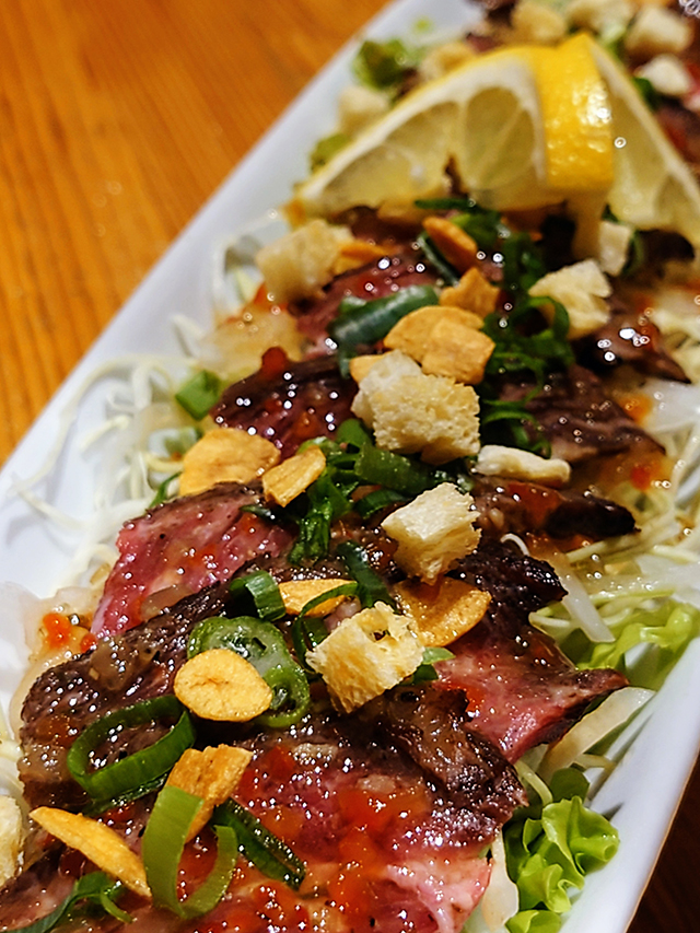 平井さん:「牛タタキのカルパッチョ」と「明太クリームうどん」ですね。この2つは創業当初からずっと変わらない不動のツートップなんです。それから、地元・八代産のトマトを贅沢に使った「丸ごとトマトのガーリックチーズ焼き」もおすすめ。不知火海で獲れた旬の魚介も、素材の良さを味わっていただけるよう、刺身や天ぷらなど最高の状態で提供しています。